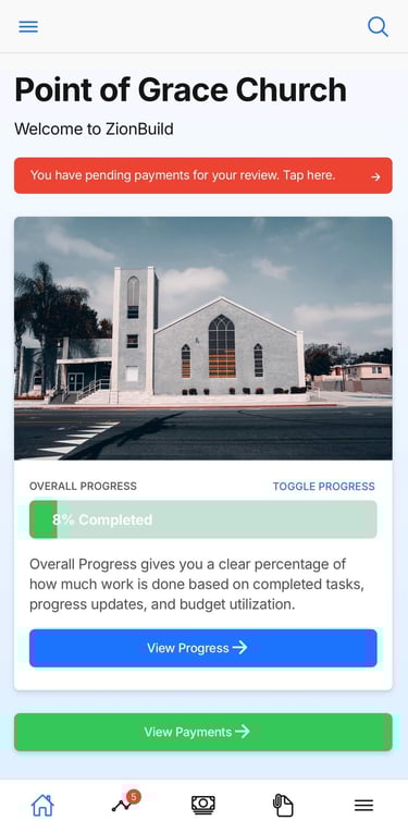 ZionBuild Homeowner Mobile Web App is an optional app that gives homeowners real-time access to contractor-approved project updates, payment status, and change orders—building transparency, trust, and smoother approvals throughout the construction journey.