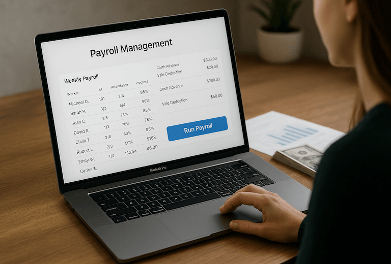 Track each worker’s attendance and progress, then run your entire weekly payroll in just one click. Our system is custom-built to match how you handle payouts — including vale and cash advance deductions, automated calculations, and payroll summaries.