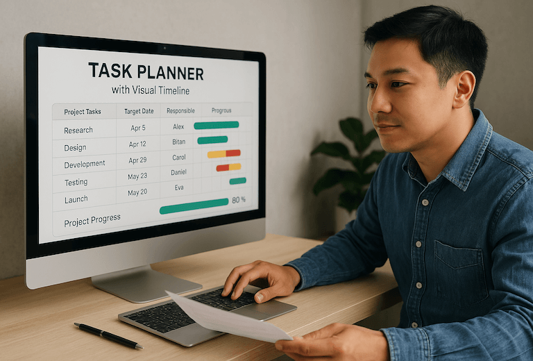 Plan project tasks ahead, assign deadlines, and view overall progress through a visual project timeline.