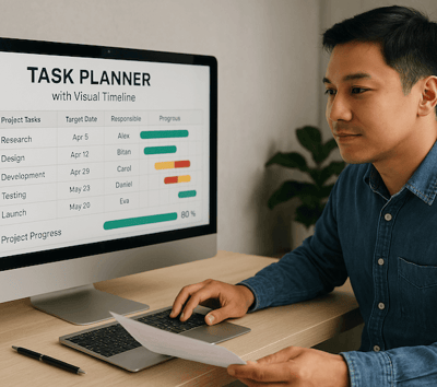Plan all project tasks ahead — set target dates, assign responsibilities, and see everything laid out in a visual timeline. As tasks are completed, the system automatically updates the overall project progress — so you stay on track and in control.